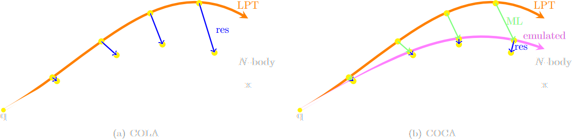 $$F_\theta(\mathbf{x}, a) = \frac{3 \Omega_m}{2} \nabla \left[ \phi_{PM} (\mathbf{x}) \ast \mathcal{F}^{-1} (1 + \color{#996699}{f_\theta(a,|\mathbf{k}|)}) \right] $$