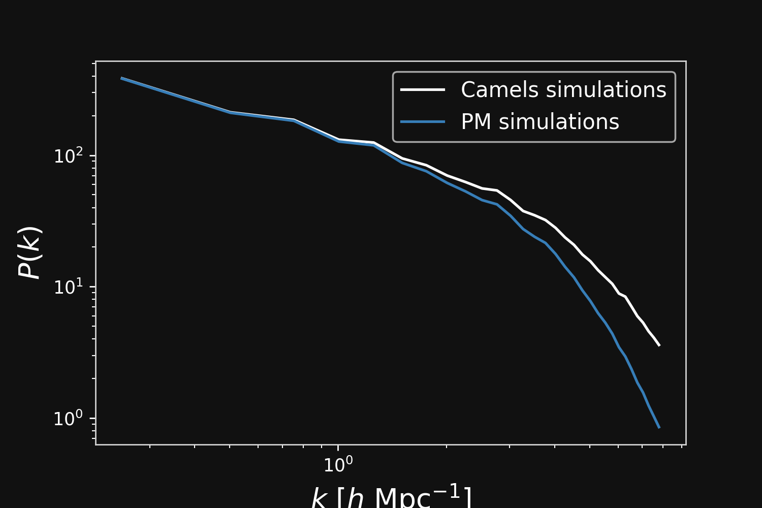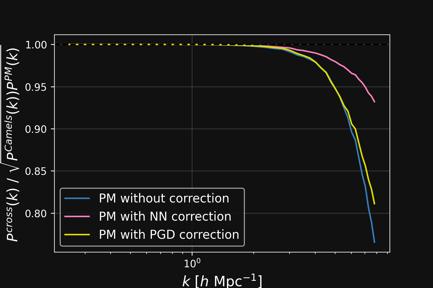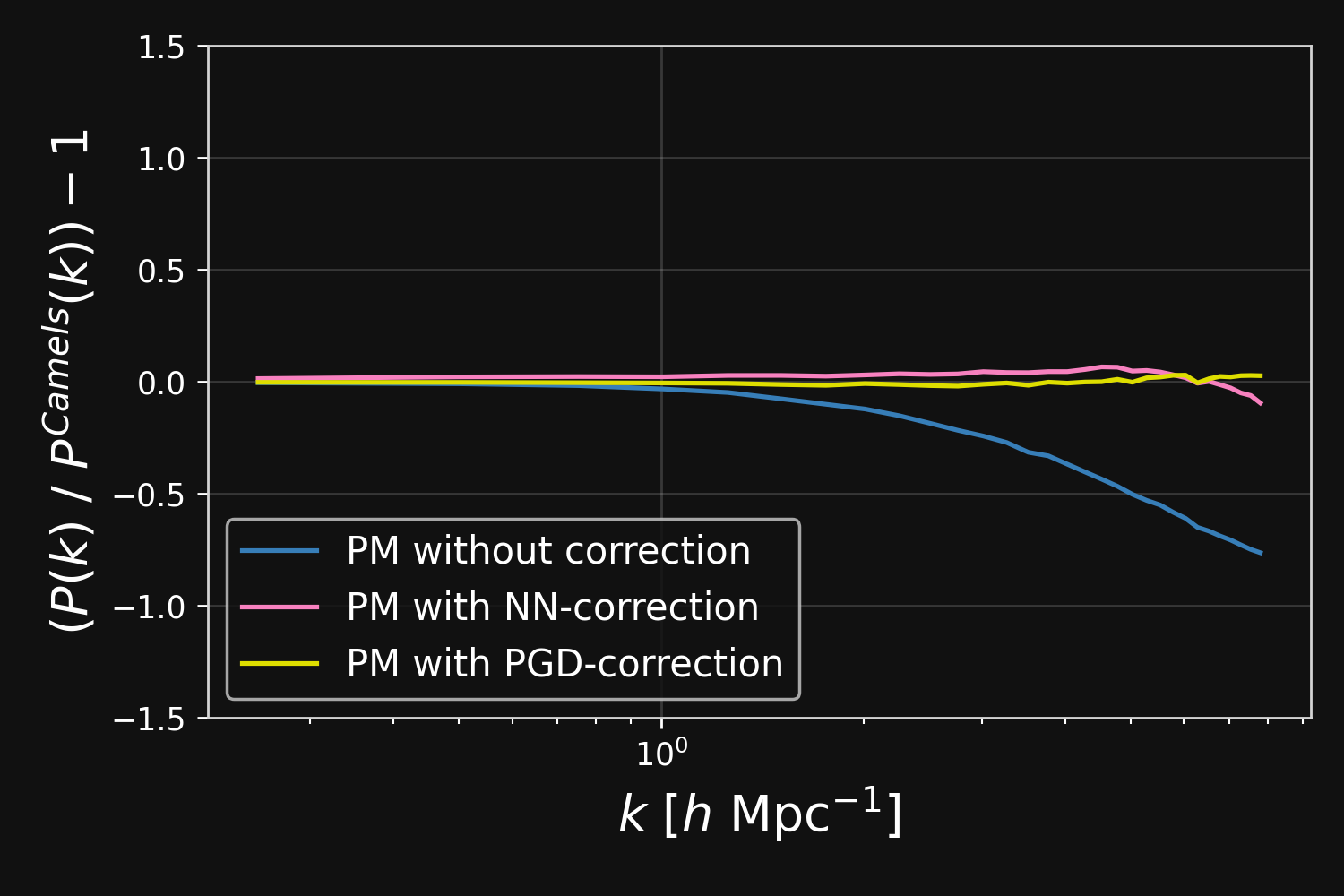 $$F_\theta(\mathbf{x}, a) = \frac{3 \Omega_m}{2} \nabla \left[ \phi_{PM} (\mathbf{x}) \ast \mathcal{F}^{-1} (1 + \color{#996699}{f_\theta(a,|\mathbf{k}|)}) \right] $$